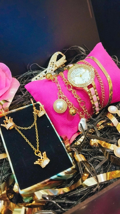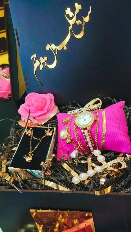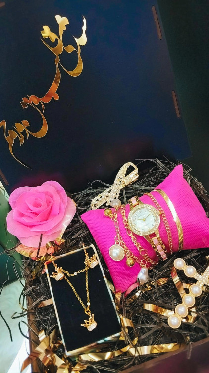محتویات باکس شامل (ساعت طرح سرامیک ونگینی هست ویو موحرارتی وبرقی پک دستبند4لاین طلایی،گیره مو2عدد نیمست استیل تاج،گل وباکس چوبی وپوشال )